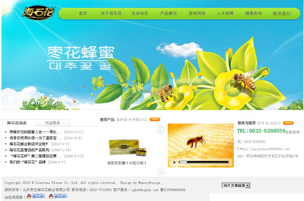 (韓國獨(dú)資)棗莊市海石花蜂業(yè)有限公司 海石花蜂業(yè)有限公司始創(chuàng)于1982年7月,座落在舉世聞名的冠世榴園腹地,這里群山起伏,榴花似火,蜜蜂翩翩飛舞,風(fēng)景秀麗。 海石花蜂業(yè)是一家集養(yǎng)蜂、蜂產(chǎn)品深加工科貿(mào)為一體化的出口型企業(yè),產(chǎn)品出口日本、韓國、加拿大等諸多國家。公司現(xiàn)有四大養(yǎng)蜂基地:中國冠世榴園生態(tài)養(yǎng)蜂基地、云南西雙版納生態(tài)養(yǎng)蜂基地、黃山藥谷養(yǎng)蜂基地、山海關(guān)范家鎮(zhèn)有機(jī)蜂產(chǎn)品基地.充足的蜜源保證了產(chǎn)品更純、更鮮的特點(diǎn)。海石花企業(yè)擁有多項(xiàng)行業(yè)領(lǐng)先的技術(shù),所有產(chǎn)品均通過HACCP食品安全管理體系認(rèn)證、綠色食品認(rèn)證、有機(jī)食品認(rèn)證等. 公司總經(jīng)理周長信曾先后兩次在人民大會(huì)堂受到國家總理溫家寶、國家副總理回良玉的親切接見,被譽(yù)為中國養(yǎng)蜂狀元.現(xiàn)任中國蜂協(xié)理事,市政協(xié)常委委員. 由著名導(dǎo)演張惠中執(zhí)導(dǎo),張繼編劇的電視連續(xù)劇《石榴花開》中海石花蜂業(yè)系列蜂產(chǎn)品有多次不同角度的呈現(xiàn),《石榴花開》的許多劇情都是在海石花公司、海石花養(yǎng)蜂基地拍攝的,首播已在陜西綜藝臺(tái)等地方電視臺(tái)陸續(xù)開播,隨后各地方衛(wèi)視都將全面播出。 公司不斷發(fā)展壯大,形成了集海石花蜂業(yè)養(yǎng)蜂基地、海石花蜂業(yè)生產(chǎn)基地為一體的現(xiàn)代化、規(guī);某隹谛推髽I(yè),成為國內(nèi)同行業(yè)中的佼佼者。 海石花蜂業(yè)有限公司技術(shù)力量雄厚,產(chǎn)品已發(fā)展為六大系列、100多個(gè)單品,產(chǎn)品出口日本、韓國、加拿大等諸多國家。 棗莊網(wǎng)站制作 |